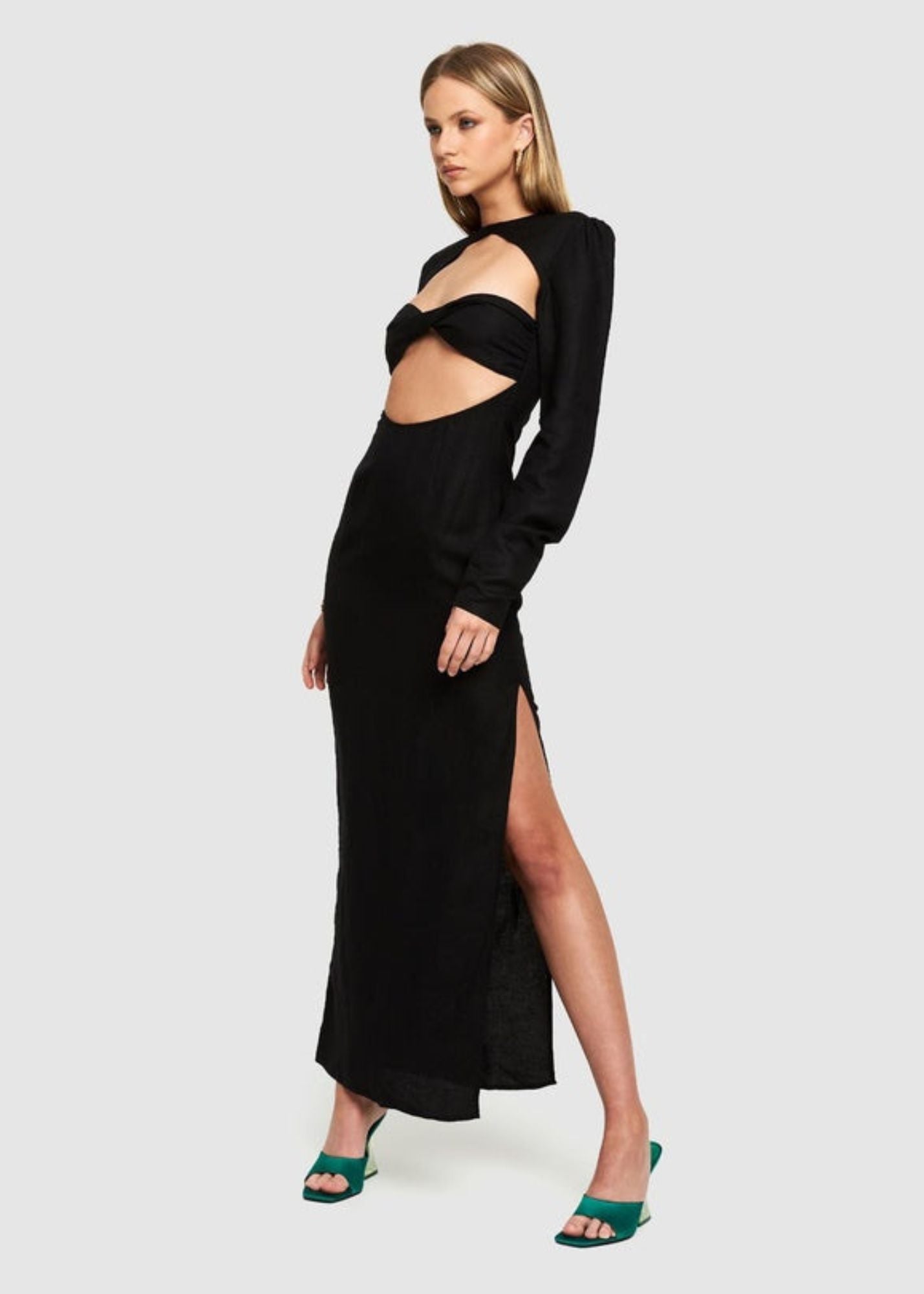 With dramatic sleeves and a sultry cut-out bust, the Aswan Cut-Out Maxi Dress from Lioness is a vision of elegance meets power-dressing, soon to be your go-to for special events