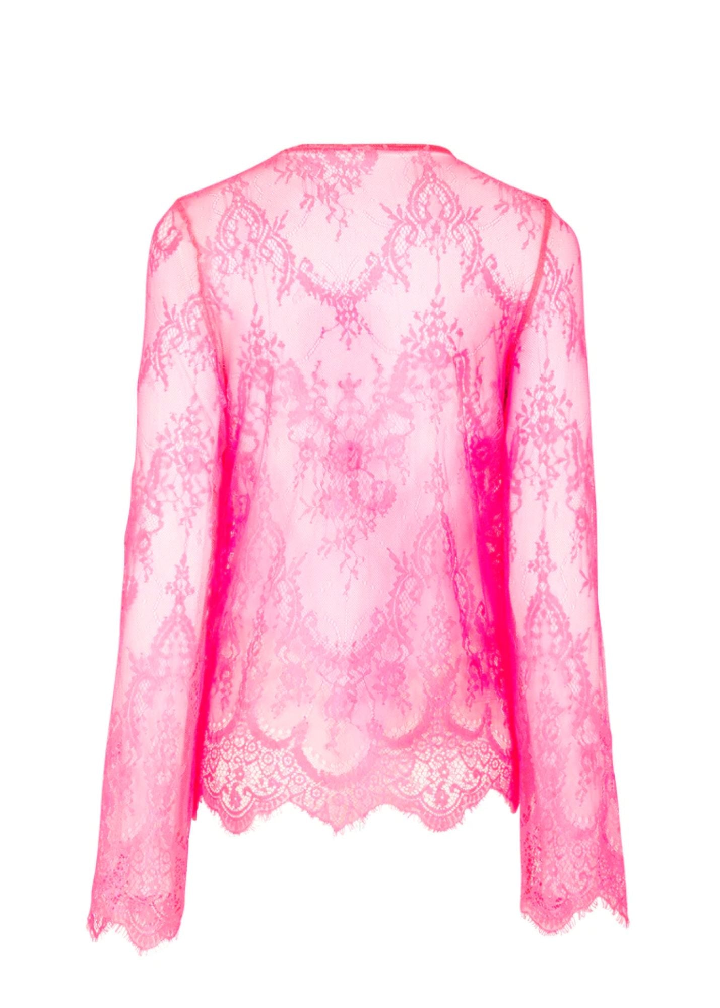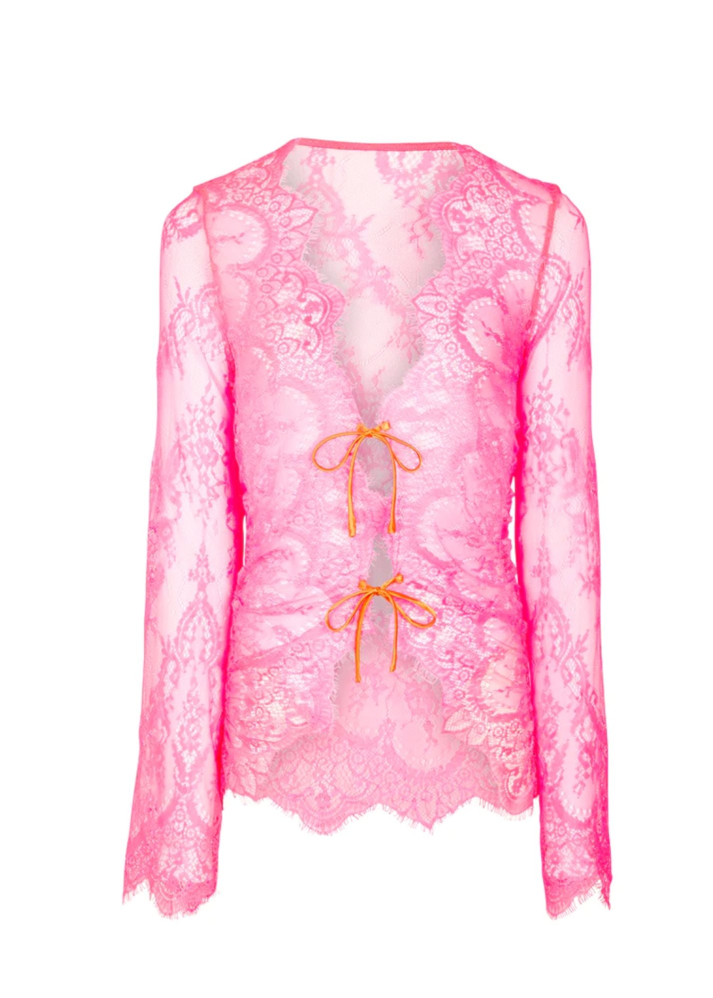 In a striking hot pink - contrasting the energy of the delicate lace, inspired by floral spring blooms - this top is a well rounded encapsulation of hyper-feminine power dressing. With two front tie fastenings in a marigold orange (our favourite colour combo, ever), intricate scalloped trim and slightly flared sleeves. Layer over a bralette, bikini or just your go-to tee.