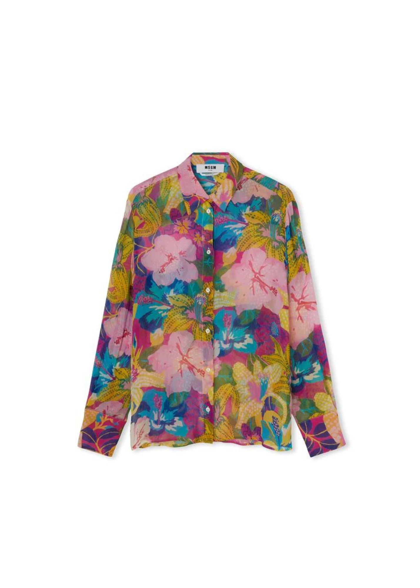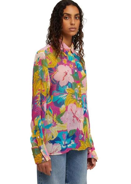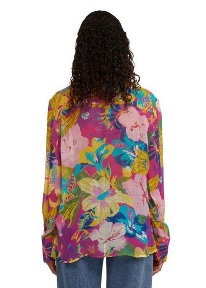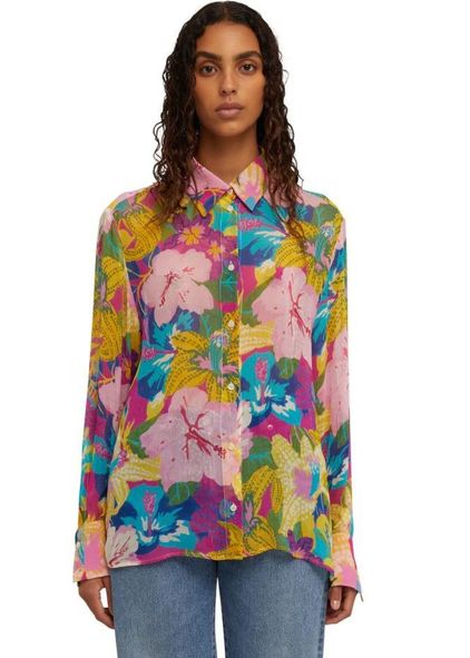 Viscose crepon shirt with "Tropical" print. Classic collar and cuffs with straight bottom. Frontal opening with buttons.
